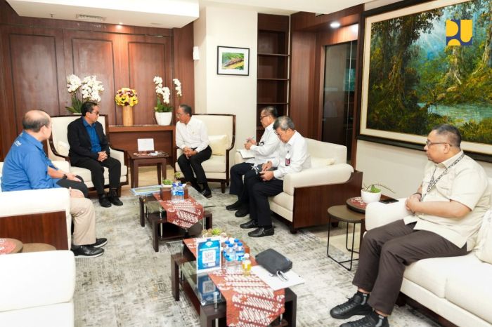 ACEBanten.com  – Menteri Pekerjaan Umum (PU) Dody Hanggodo didampingi Sekretaris Jenderal Kementerian PU Mohammad Zainal Fatah, Direktur Jenderal Pembiayaan Infrastruktur Rachman Arief Dienaputra, dan Staf Khusus Menteri Bidang Teknologi dan Kepatuhan Intern Syamsul Bachri Yusuf menerima kunjungan Kepala Badan Bank Tanah Parman Nataatmadja dan jajaran di Kementerian PU, Kamis (10/04/2025). Kunjungan ini mendiskusikan mengenai peluang pemanfaatan lahan yang telah dimiliki Badan Bank Tanah dalam mendukung penyediaan infrastruktur di seluruh Indonesia.